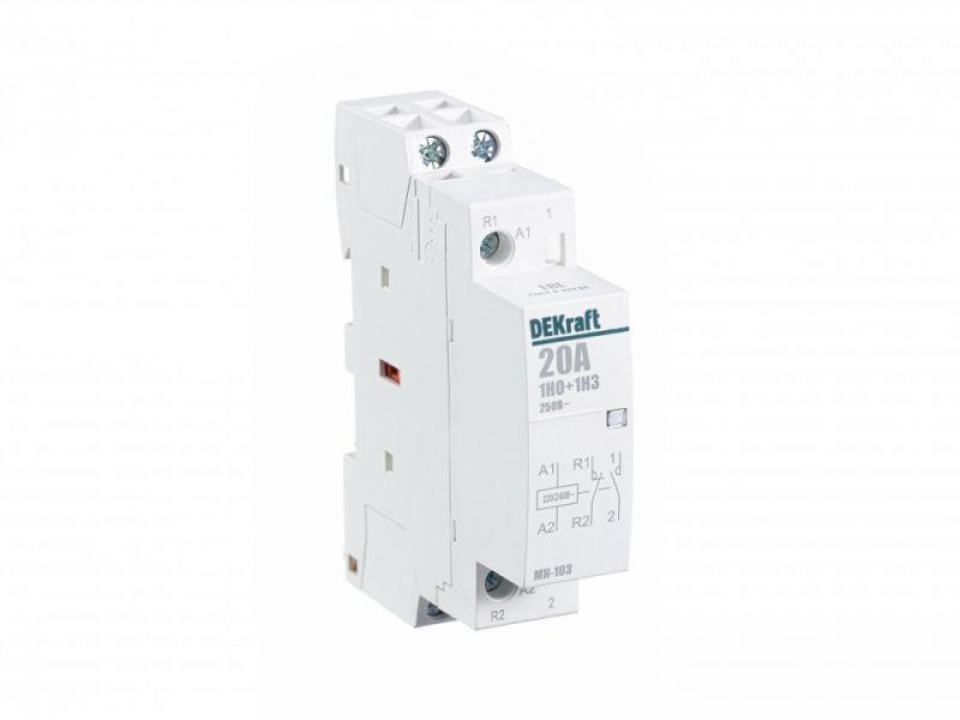 Модульный контактор серии МК-103 Dekraft; ном.ток 20 А (АС-7а); кол-во и исполнение контактов – 1НО+1НЗ; напряжение управления 220 В пер.тока; ширина – 1 мод. х 18 мм; установка – на DIN-рейку. Контакторы МК-103 применяются в сетях напряжением до 400 В пер.тока для дистанционного управления небольшими нагрузками, требующими большого количества включений / отключений, например, насосы, системы вентиляции и т.п. Модульные контакторы не требуют дополнительных настроек и специального обслуживания.