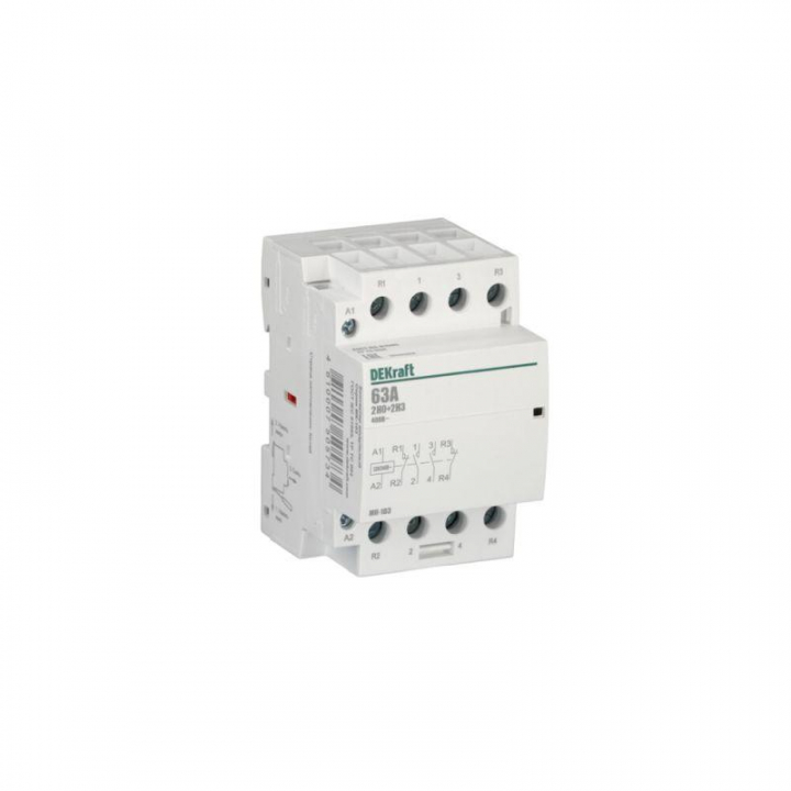 Модульный контактор серии МК-103 Dekraft; ном.ток 63 А (АС-7а); кол-во и исполнение контактов – 2НО+2НЗ; напряжение управления 220 В пер.тока; ширина – 3 мод. х 18 мм; установка – на DIN-рейку. Контакторы МК-103 применяются в сетях напряжением до 400 В пер.тока для дистанционного управления небольшими нагрузками, требующими большого количества включений / отключений, например, насосы, системы вентиляции и т.п. Модульные контакторы не требуют дополнительных настроек и специального обслуживания.