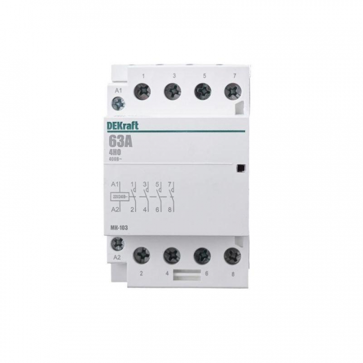 Модульный контактор серии МК-103 Dekraft; ном.ток 63 А (АС-7а); кол-во и исполнение контактов – 4НО; напряжение управления 220 В пер.тока; ширина – 3 мод. х 18 мм; установка – на DIN-рейку. Контакторы МК-103 применяются в сетях напряжением до 400 В пер.тока для дистанционного управления небольшими нагрузками, требующими большого количества включений / отключений, например, насосы, системы вентиляции и т.п. Модульные контакторы не требуют дополнительных настроек и специального обслуживания.