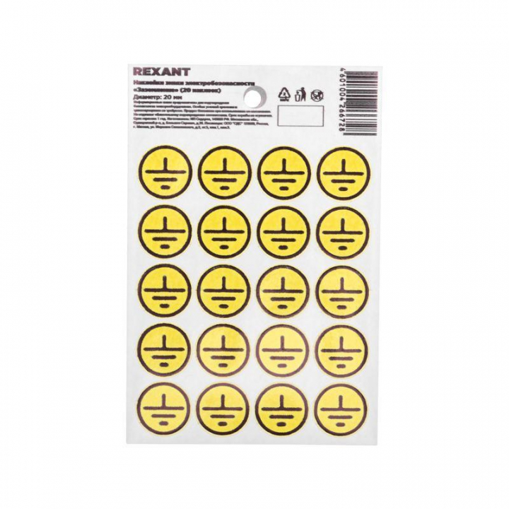 Наклейка знак электробезопасности «Заземление» d20мм (с хедером 20шт на листе) Rexant 56-0010-01