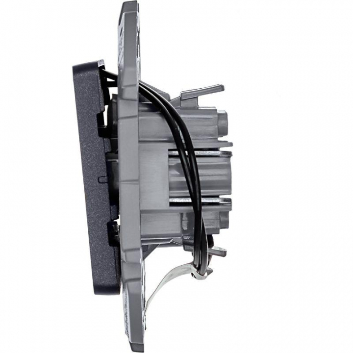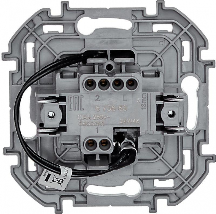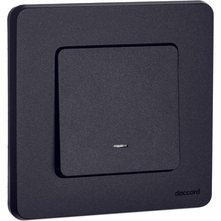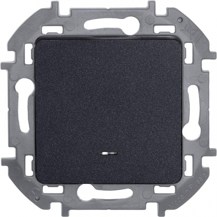 Переключатель одноклавишный с подсветкой/индикацией скрытого монтажа Inspiria, цвет "Антрацит", номинальный ток 10АХ, напряжение ~250В, безвинтовые зажимы. Устанавливается в жилых и общественных помещениях для управления приборами освещения, вентиляции и т.д. Предназначен для управления одной нагрузкой с одного, двух или более мест (совместно с перекрёстными переключателями).