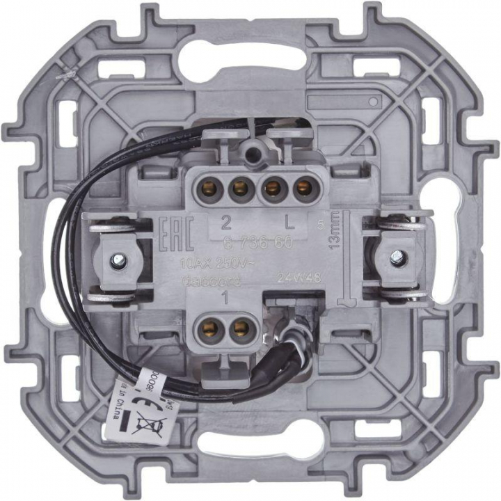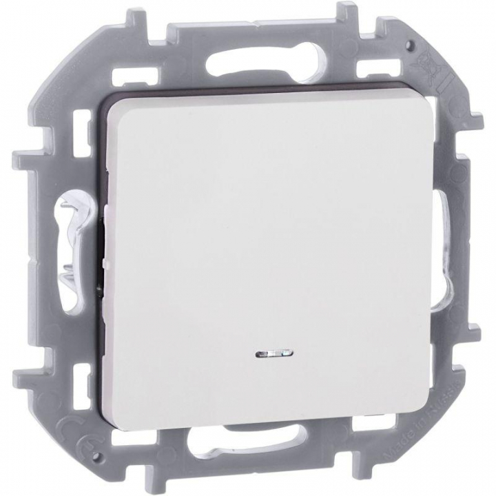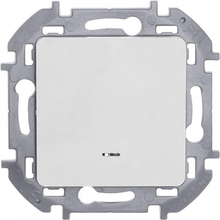 Переключатель одноклавишный с подсветкой/индикацией скрытого монтажа Inspiria, цвет "Белый", номинальный ток 10АХ, напряжение ~250В, безвинтовые зажимы. Устанавливается в жилых и общественных помещениях для управления приборами освещения, вентиляции и т.д. Предназначен для управления одной нагрузкой с одного, двух или более мест (совместно с перекрёстными переключателями).