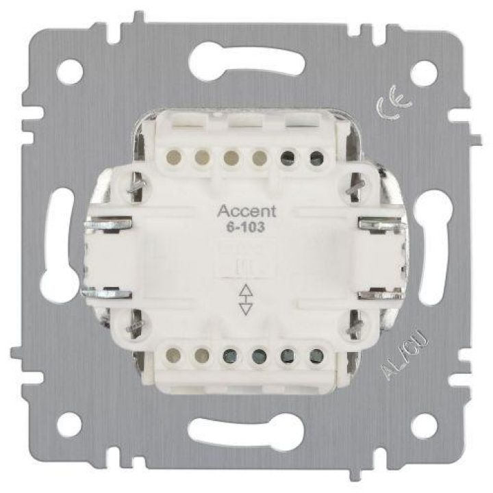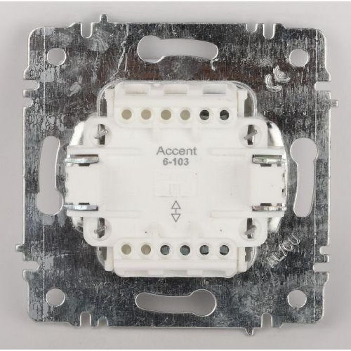 Переключатель 1-клавишный серии Intro Accent скрытой установки механизм цвет белый 6-103-01. Номинальные характеристики 10А 250В. Выполнен из негорючего термопласта, оснащён винтовыми клеммами. Парные клеммы обеспечивают соединение шлейфом. Монтаж в подрозетник производится и на лапки, и на винты. Рамка приобретается отдельно. В серии представлены рамки до 5 постов: на 1 пост - 6-501-хх, на 2 поста - 6-502-хх, на 3 поста - 6-503-хх, на 6 поста - 4-504-хх, на 5 постов - 6-505-хх (где хх - цветовой код: 01 - белый, 01М - матовый белый, 02 - слоновая кость, 03 - алюминий, 04 - шампань, 05 - антрацит, 06 - перламутр, 07 - графит, 08 - бронза, 09 - титан, 10 - венге, 11 - сосна)