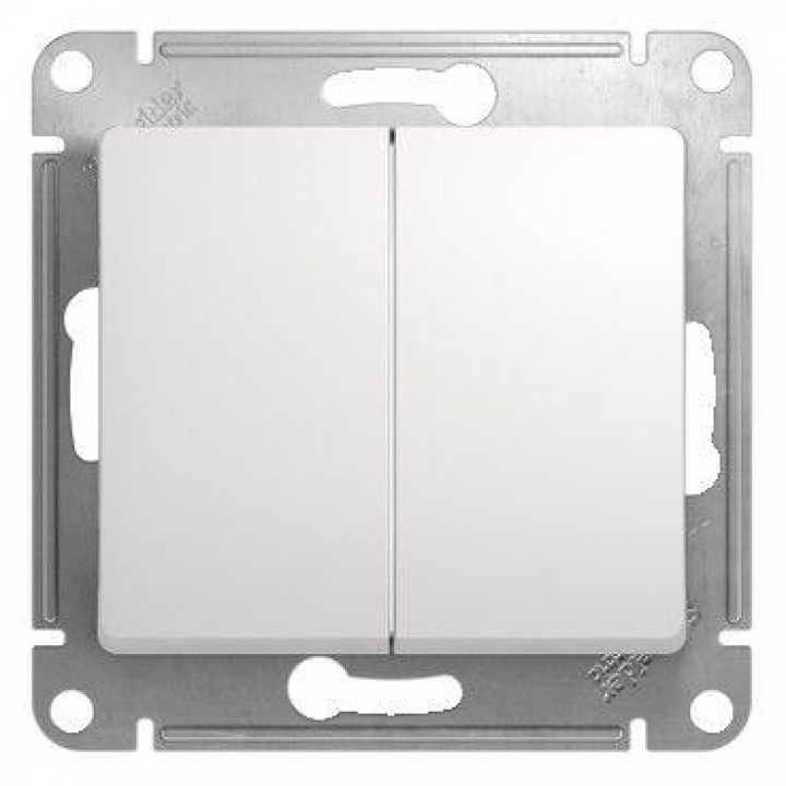 Механизм Systeme Electric (ранее Schneider Electric) серии Glossa (цвет белый) переключателя 2-клавишного подходит для сетей 250 В, на ток 10 А. Переключатель позволяет управлять одним источником света с двух точек. Выполнен из материала PС+ASA, стойкого к УФ-излучению и появлению царапин. Эргономичные клеммы расположены в два ряда: сверху и снизу.
