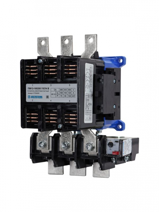 Пускатели электромагнитные серии ПМ12 предназначены для дистанционного пуска непосредственным подключением к сети, остановки и реверсирования трёхфазных асинхронных электродвигателей с короткозамкнутым ротором на напряжение до 660 В переменного тока 50 и 60 Гц. При наличии тепловых реле пускатель осуществляет защиту управляемых электродвигателей от: * перегрузки; * токов, возникающих при обрыве одной из фаз; * асимметрии фаз. *Пускатели ПМ12 100-250 - IP00, IP20* * Пускатели отличаются высокой механической и коммутационной износостойкостью, что обеспечивает длительный срок службы даже в условиях интенсивной эксплуатации; * Соответствует требованиям ГОСТ, предъявляемым к аппаратам промышленного назначения, обеспечивает высокую надёжность срабатывания; * Отсутствие шумов и повышенная надёжность работы; * Простота конструкции и высокая надёжность, испытанная временем эксплуатации. *Пускатели ПМ12 100-250 в корпусе – IP40, IP54* * Простота конструкции, высокая надёжность, испытанная временем эксплуатации; * Соответствует требованиям ГОСТ, предъявляемым к аппаратам промышленного назначения, обеспечивает высокую надёжность срабатывания; * Высокая нагрузочная способность коммутации в общепромышленных режимах АС-3; * Больший коммутационный ресурс износостойкости. * Наличие защитного корпуса обеспечивает высокую степень защиты IP40, IP54.