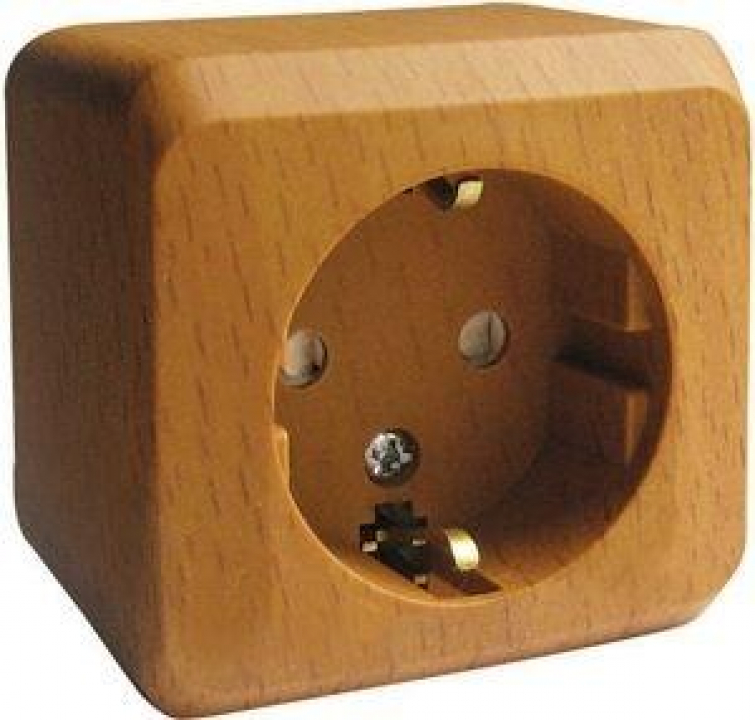 Розетка Systeme Electric (ранее Schneider Electric) ЭТЮД (бук, открытой установки) одноместная с заземлением и шторками предназначена для применения в сетях до 250В, на ток до 16А. Шторки открываются при одновременном давлении в оба отверстия и препятствуют проникновению посторонних предметов. Они обеспечивают дополнительную безопасность в доме, где находятся дети. Изделия цвета Бук обладают уникальным рисунком, напоминающим древесный сруб. Сделано в России.