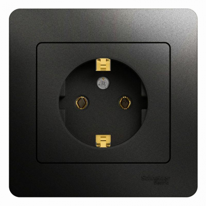 Розетка Systeme Electric (ранее Schneider Electric) серии Glossa (в сборе, цвет антрацит) одинарная с заземлением, без шторок подходит для сетей 250 В, на ток 16 А. Выполнен из материала PС+ASA, стойкого к УФ-излучению и появлению царапин. Эргономичные клеммы розеток расположены в один ряд.