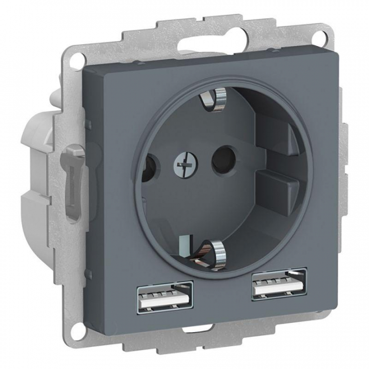 Розетка силовая Systeme Electric (ранее Schneider Electric) серии AtlasDesign 16А в цвете грифель с заземлением и шторками с розеткой USB, с двумя разъемами типа А. Лицевые детали из качественного ABS-пластика, устойчивого к царапинам и УФ-излучению. Заземляющий контакт обеспечивает дополнительную защиту от удара электрическим током. Шторки обеспечивают дополнительную безопасность в доме, где находятся дети. Одно устройство позволяет как подключить бытовые приборы, так и зарядить мобильные устройства.