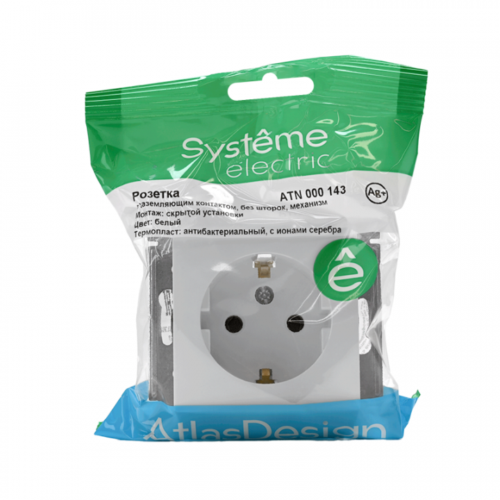 Механизм Systeme Electric (ранее Schneider Electric) серии AtlasDesign в цвете белый розетки одинарной с заземлением и без шторок подходит для сетей 250 В, на ток 16 А. Пластик с ионами серебра в белом цвете обеспечивает антибактериальный эффект. Заземляющий контакт обеспечивает дополнительную защиту от удара электрическим током. При наличии заземления электрический потенциал уходит в землю, защищая человека. Лицевые детали из качественного ABS-пластика, устойчивого к царапинам и УФ-излучению.