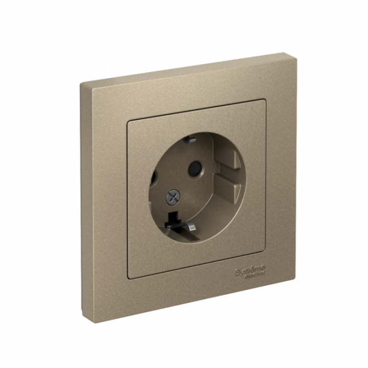 Розетка в сборе Systeme Electric (ранее Schneider Electric) серии AtlasDesign в цвете шампань одинарная с заземлением и без шторок подходит для сетей 250 В, на ток 16 А. Заземляющий контакт обеспечивает дополнительную защиту от удара электрическим током. При наличии заземления электрический потенциал уходит в землю, защищая человека. Лицевые детали из качественного ABS-пластика, устойчивого к царапинам и УФ-излучению. Изделие поставляется в комплекте с рамкой того же цвета.