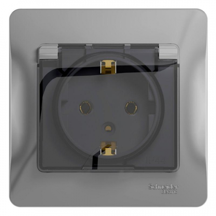 Розетка Systeme Electric (ранее Schneider Electric) серии Glossa (в сборе, цвет алюминий) одинарная с заземлением, шторками и крышкой подходит для сетей 250 В, на ток 16 А. Заземляющий контакт обеспечивает дополнительную защиту от удара электрическим током. При наличии заземления электрический потенциал уходит в землю, защищая человека. Выполнен из материала PС+ASA, стойкого к УФ-излучению и появлению царапин. Эргономичные клеммы розеток расположены в один ряд.