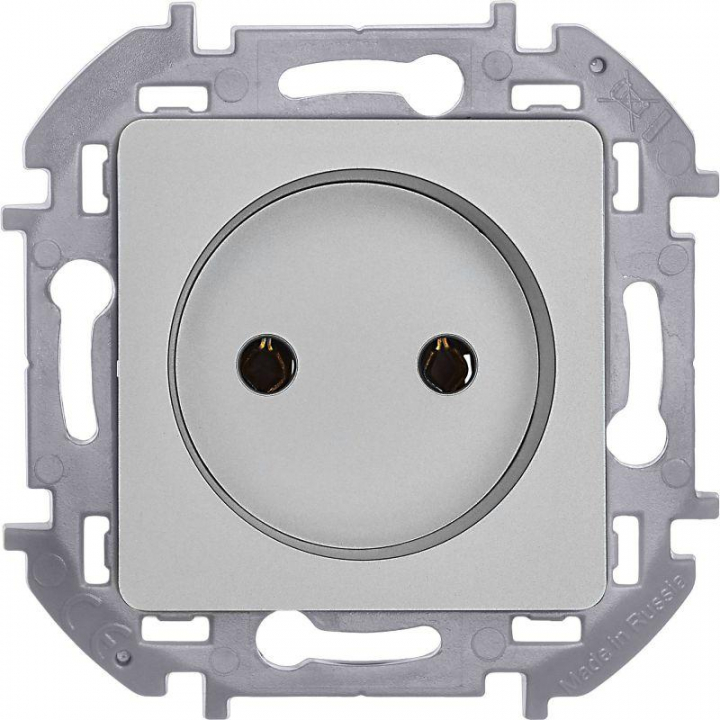 Розетка без заземления для скрытого монтажа Inspiria, цвет "Алюминий", максимальный ток 16А, напряжение ~250В, максимальная мощность 3680Вт, винтовые зажимы. Применяется для присоединения однофазных электрических потребителей к сети переменного тока в зданиях с проводкой без заземления (без защитного проводника).