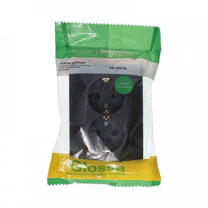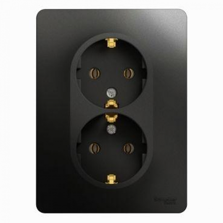 Розетка двойная Systeme Electric (ранее Schneider Electric) серии Glossa (в сборе, цвет антрацит) с заземлением, без шторок подходит для сетей 250 В, на ток 16 А. - Заземляющий контакт обеспечивает дополнительную защиту от удара электрическим током. При наличии заземления электрический потенциал уходит в землю, защищая человека. - Выполнен из материала PС+ASA, стойкого к УФ-излучению и появлению царапин. - Двойная розетка позволяет подключить два устройства в одном месте.
