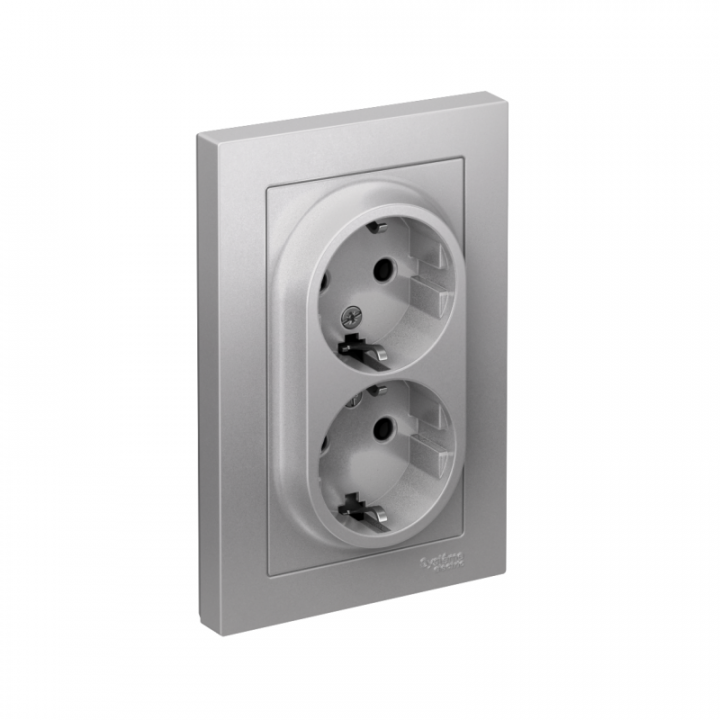 Розетка двойная в сборе Systeme Electric (ранее Schneider Electric) серии AtlasDesign в цвете алюминий с заземлением, без шторок подходит для сетей 250 В, на ток 16 А. Заземляющий контакт обеспечивает дополнительную защиту от удара электрическим током. Лицевые детали из качественного ABS-пластика, устойчивого к царапинам и УФ-излучению. Двойная розетка позволяет подключить два устройства в одном месте. Изделие поставляется в комплекте с рамкой того же цвета.