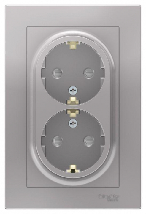 Розетка двойная в сборе Systeme Electric (ранее Schneider Electric) серии AtlasDesign в цвете алюминий с заземлением и шторками подходит для сетей 250 В, на ток 16 А. Заземляющий контакт обеспечивает дополнительную защиту от удара электрическим током. Лицевые детали из качественного ABS-пластика, устойчивого к царапинам и УФ-излучению. Двойная розетка позволяет подключить два устройства в одном месте. Изделие поставляется в комплекте с рамкой того же цвета.