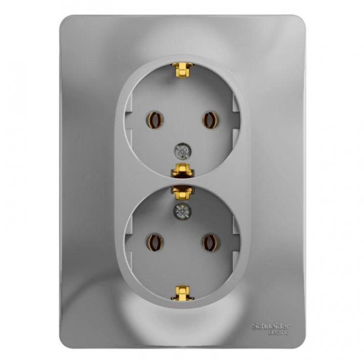 Розетка двойная Systeme Electric (ранее Schneider Electric) серии Glossa (в сборе, цвет алюминий) с заземлением, без шторок подходит для сетей 250 В, на ток 16 А. Заземляющий контакт обеспечивает дополнительную защиту от удара электрическим током. При наличии заземления электрический потенциал уходит в землю, защищая человека. Выполнен из материала PС+ASA, стойкого к УФ-излучению и появлению царапин. Двойная розетка позволяет подключить два устройства в одном месте.