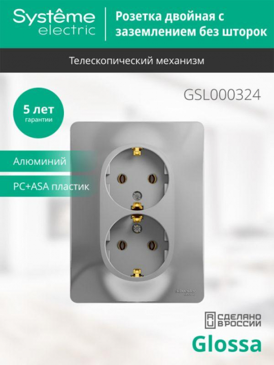 Розетка двойная Systeme Electric (ранее Schneider Electric) серии Glossa (в сборе, цвет алюминий) с заземлением, без шторок подходит для сетей 250 В, на ток 16 А. - Заземляющий контакт обеспечивает дополнительную защиту от удара электрическим током. При наличии заземления электрический потенциал уходит в землю, защищая человека. - Выполнен из материала PС+ASA, стойкого к УФ-излучению и появлению царапин. - Двойная розетка позволяет подключить два устройства в одном месте.