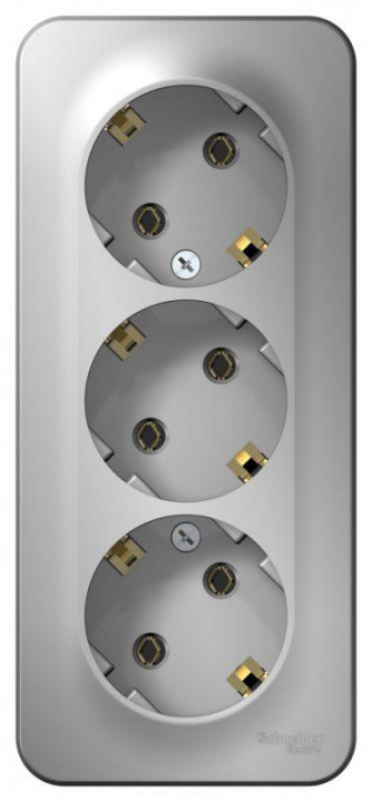 Розетка Systeme Electric (ранее Schneider Electric) BLANCA (алюминий, открытой установки) трехместная, без шторок, с заземлением и изолирующей пластиной предназначена для сетей до 250В, на ток до 16А. Трехместная розетка позволяет подключить три устройства в одном месте. Заземление обеспечивает безопасность при косвенном прикосновении. Она изготовлена из ABS-пластика, проста в установке и удобна в применении.