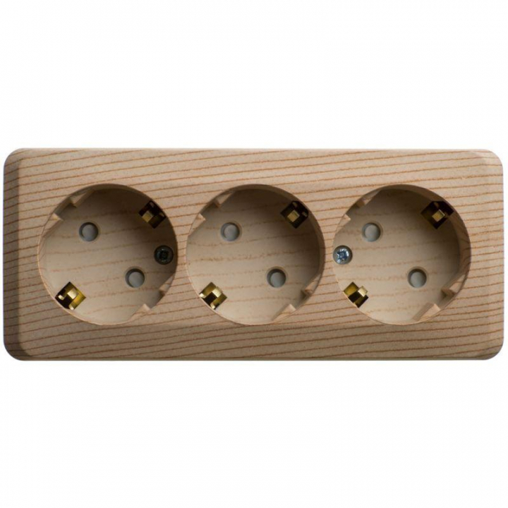 Розетка Systeme Electric (ранее Schneider Electric) ЭТЮД (сосна, открытой установки) трёхместная с заземлением и шторками предназначена для применения в сетях до 250В, на ток до 16А. Трёхместная розетка позволяет подключить три устройства в одном месте. Шторки и заземление обеспечивают дополнительную безопасность при косвенных прикосновениях. Изделия цвета Сосна обладают уникальным рисунком, напоминающим древесный сруб. Сделано в России.