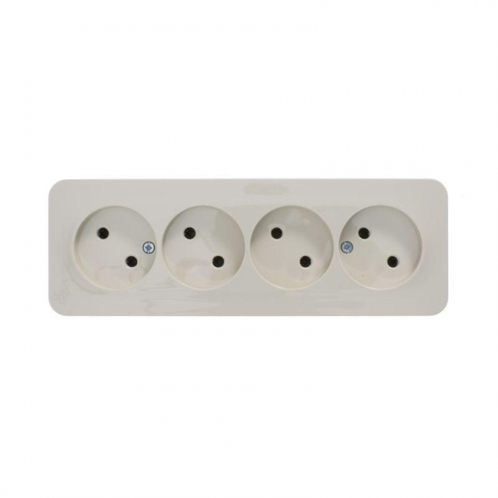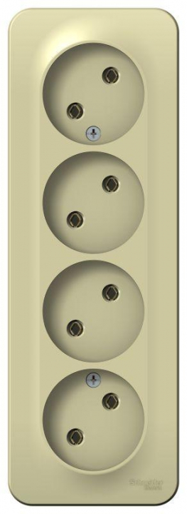 Розетка Systeme Electric (ранее Schneider Electric) BLANCA (открытой установки, цвет бежевый) четырёхместная без заземления и шторок, с изолирующей пластиной подходит для сетей 250 В, на ток 16 А. Четкая маркировка клемм для безошибочного подключения. Входные отверстия расположены под углом 45 градусов, благодаря чему можно подключить несколько устройств: вилки и адаптеры не будут мешать друг другу. Корпус изделия выполнен из ABS-пластика.