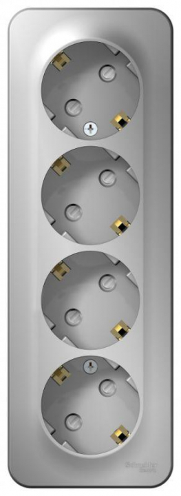 Розетка Systeme Electric (ранее Schneider Electric) BLANCA (алюминий, открытой установки) четырехместная, с заземлением, шторками и изолирующей пластиной предназначена для сетей до 250В, на ток до 16А. Четырехместная розетка позволяет подключить четыре устройства в одном месте. Шторки и заземление обеспечивают дополнительную безопасность. Она изготовлена из ABS-пластика, проста в установке и удобна в применении.
