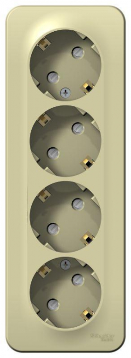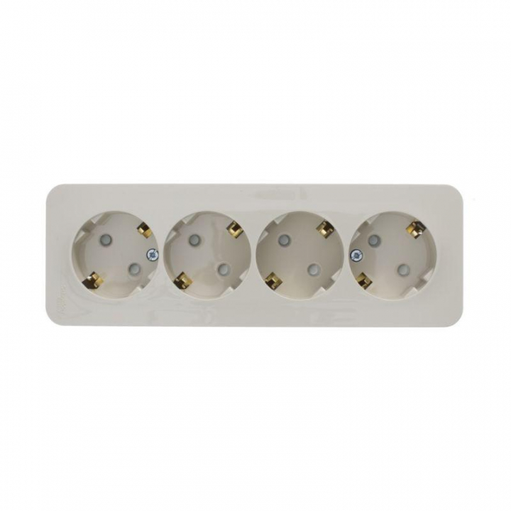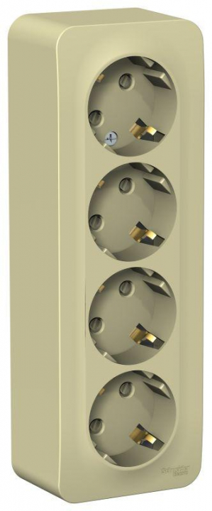 Розетка Systeme Electric (ранее Schneider Electric) BLANCA (открытой установки, цвет бежевый) четырёхместная с заземлением и шторками, с изолирующей пластиной подходит для сетей 250 В, на ток 16 А. Заземляющий контакт обеспечивает дополнительную защиту от удара электрическим током. При наличии заземления электрический потенциал уходит в землю, защищая человека. Входные отверстия расположены под углом 45 градусов, благодаря чему можно подключить несколько устройств: вилки и адаптеры не будут мешать друг другу. Корпус изделия выполнен из ABS-пластика.
