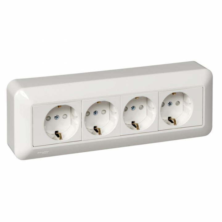 Розетка четырёхместная Systeme Electric (ранее Schneider Electric) BLANCA (открытой установки, цвет белый) с заземлением и со шторками, с монтажной стальной пластиной предназначена для сетей до 250 В на ток до 16 А. Четырёхместная розетка позволяет подключить четыре устройства в одном месте. Заземляющий контакт обеспечивает дополнительную защиту от удара электрическим током. При наличии заземления электрический потенциал уходит в землю, защищая человека. Розничная упаковка, сделано в России.