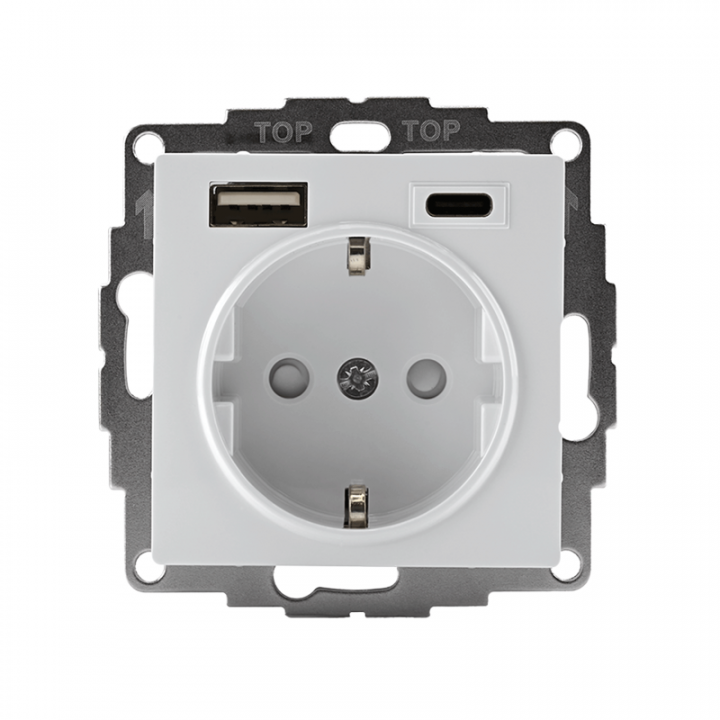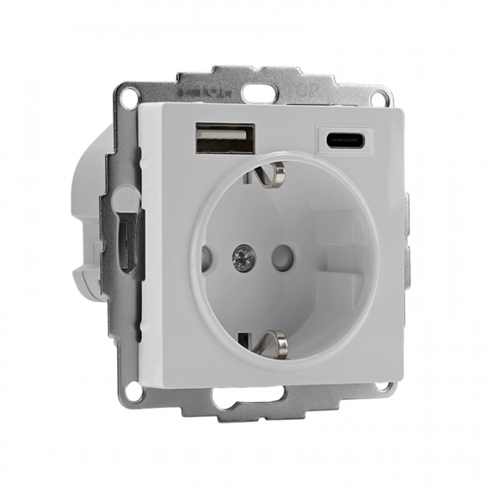 Розетка силовая Systeme Electric (ранее Schneider Electric) серии AtlasDesign 16А в цвете белый с заземлением и шторками с розеткой USB с двумя разъемами тип А и тип С. Розетка совмещает в себе сразу 3 функции в одном изделии. Удобное и современное решение для дома, офиса и других помещений. Лицевые детали из качественного ABS-пластика, устойчивого к царапинам и УФ-излучению. Заземляющий контакт обеспечивает дополнительную защиту от удара электрическим током. Шторки обеспечивают дополнительную безопасность в доме, где находятся дети. Одно устройство позволяет как подключить бытовые приборы, так и зарядить мобильные устройства.