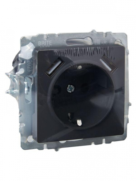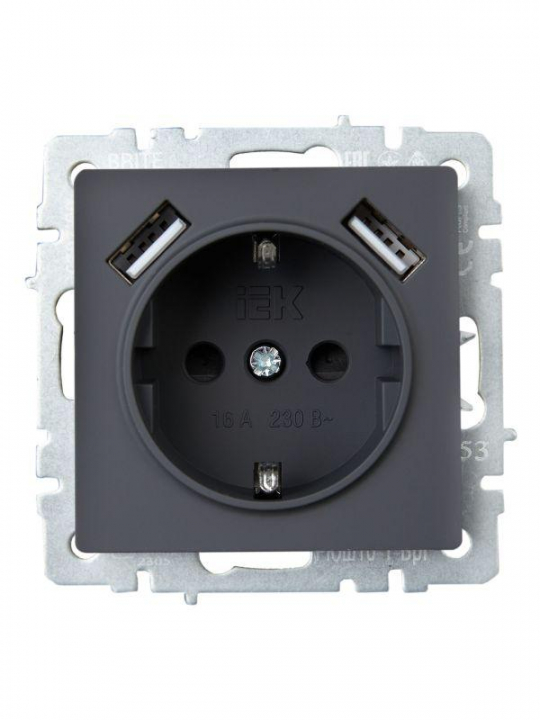 Розетка BRITE РЮш10-1-БрГ 16А с USB A+A 2.1А с заземл. защ. шторки механизм графит IEK BR-R14-16-U21-D21-K53