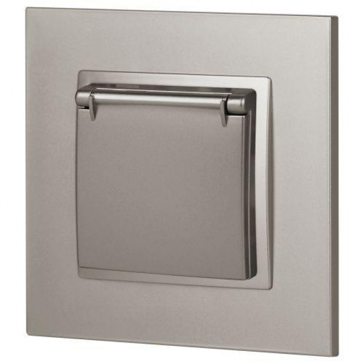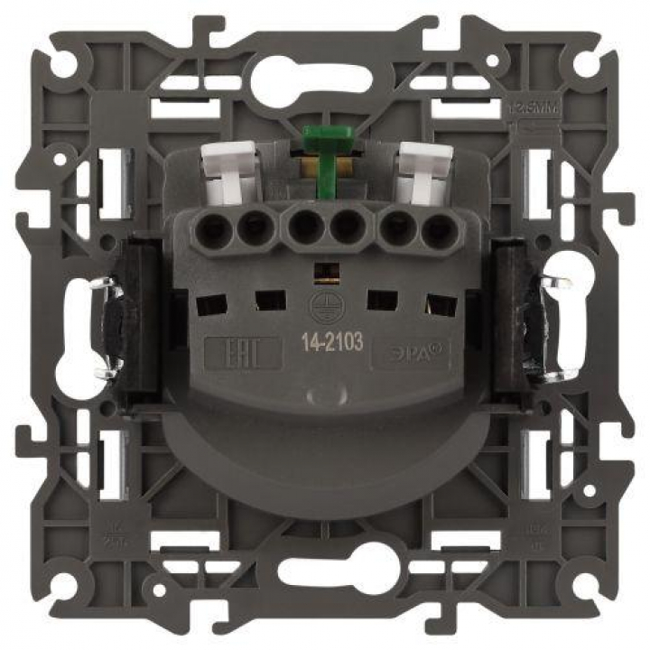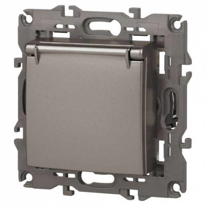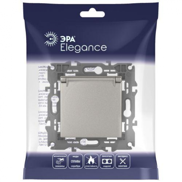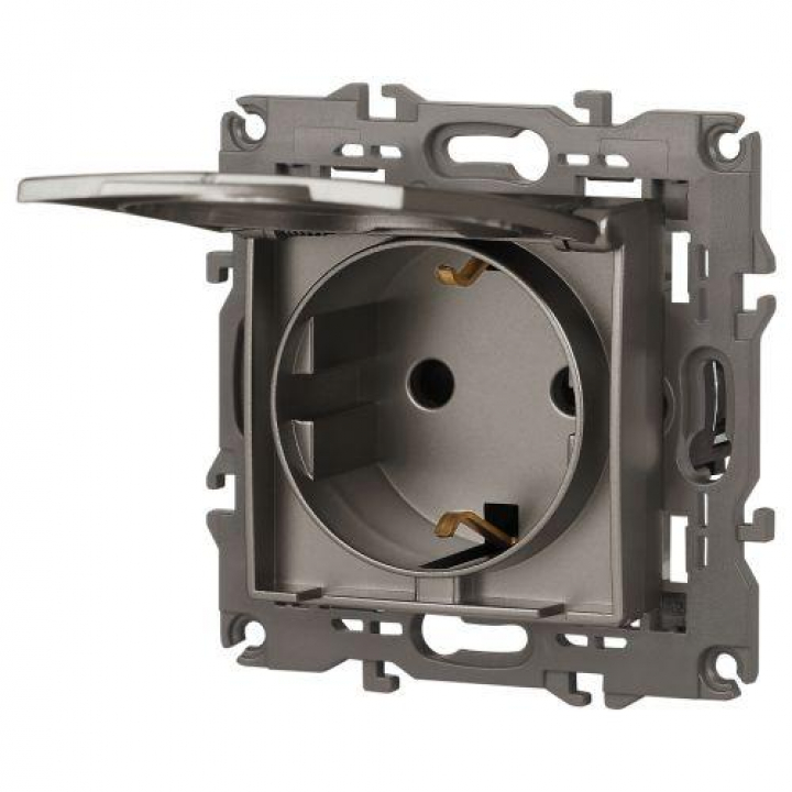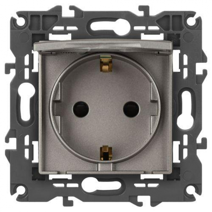 Розетка с заземлением, шторками и крышкой серии Эра Elegance цвет титан 14-2103-16. Характеристики 16А 250В. Оснащена автоматическими клеммами для надёжной фиксации жил кабеля в механизме. Рамки приобретаются отдельно.