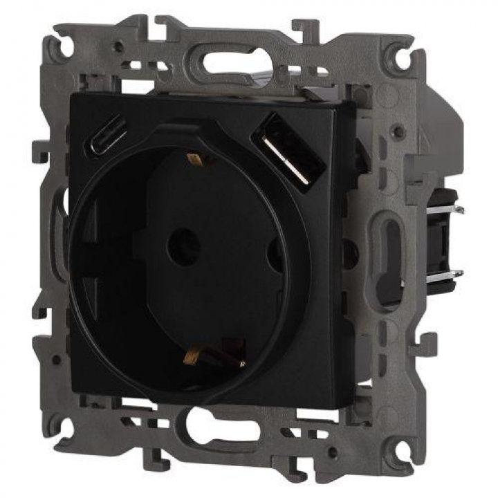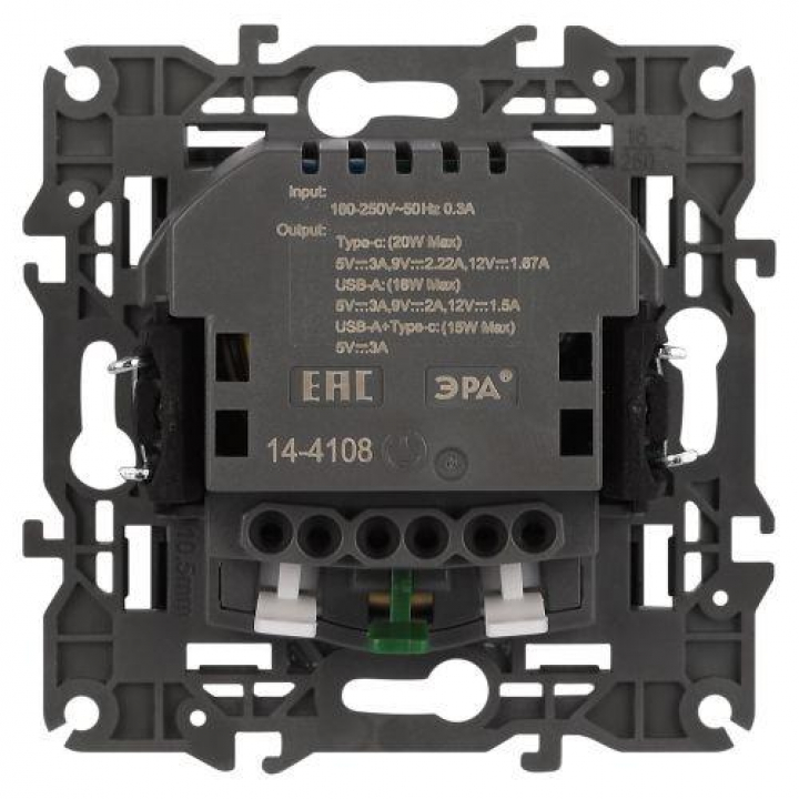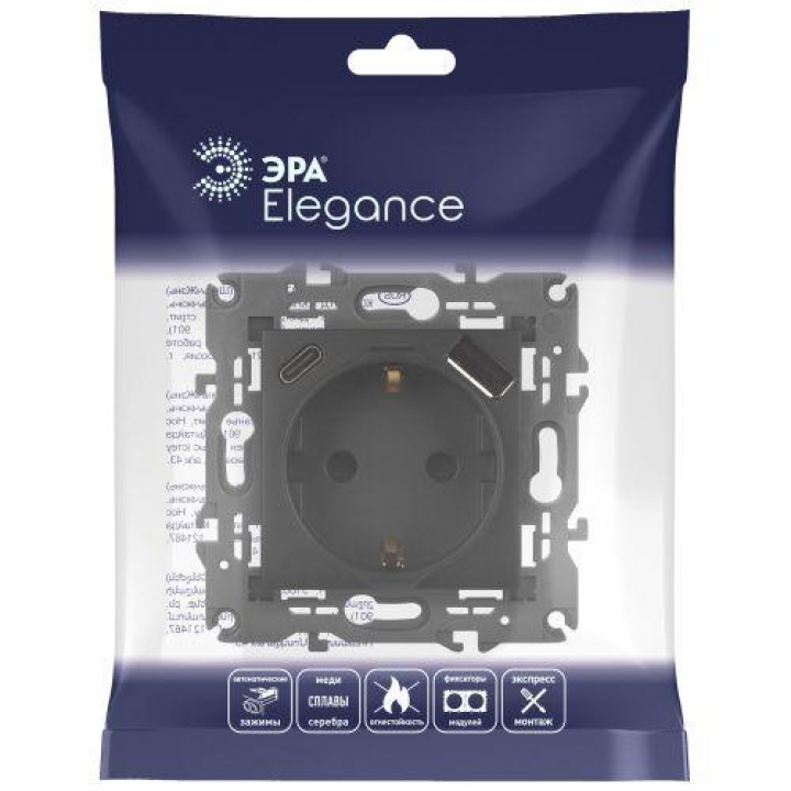 Розетка с USB A+C серии Эра Elegance 14-4108-05 цвет антрацит. Номинальные характеристики: розетка силовая – 16А 250В. Розетка USB type A – 3A 5В. Розетка USB type C – 3A 5В. Рамки приобретаются отдельно