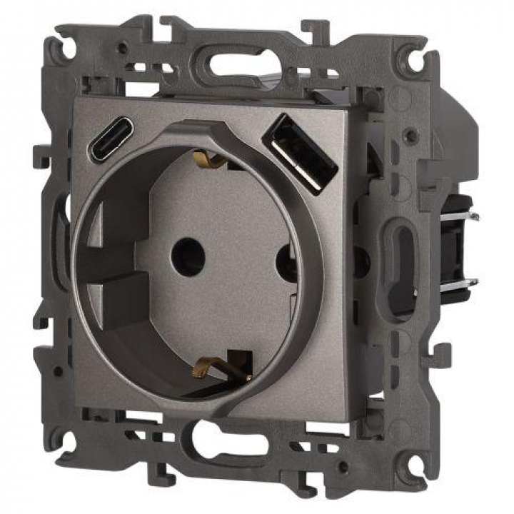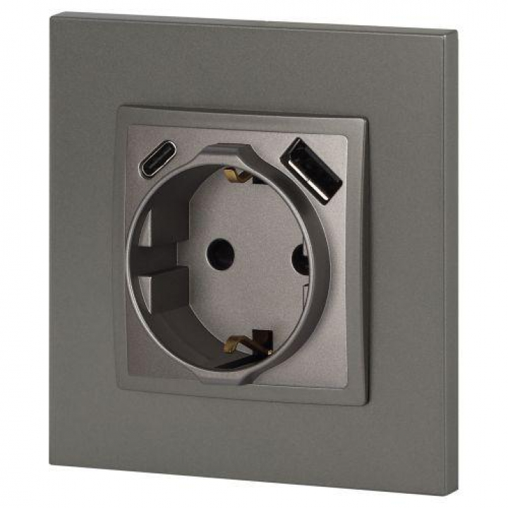 Розетка с USB A+C серии Эра Elegance 14-4108-16 цвет титан. Номинальные характеристики: розетка силовая – 16А 250В. Розетка USB type A – 3A 5В. Розетка USB type C – 3A 5В. Рамки приобретаются отдельно