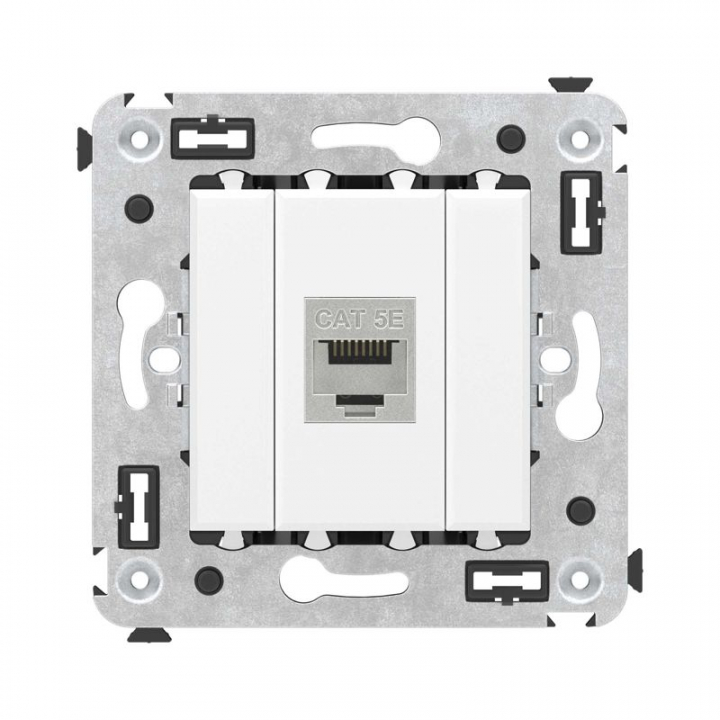 Компьютерная розетка одинарная экранированная без шторки используется для подключения компьютерной техники и соединения с патч-панелью. Компьютерная розетка предназначена для скрытого монтажа в стену, поставляется в комплекте с суппортом. Розетка RJ-45 категории 5e – это наиболее популярная на сегодняшний день модель. Она позволяет организовать сеть с частотой 125 МГц и скоростью до 1000 Мбит/с. Материал – металл, термопласт. Пластиковые детали устройства имеют оттенок "Белое облако" – это чистый белый оттенок, сочетающийся с любыми цветами палитры "Avanti".