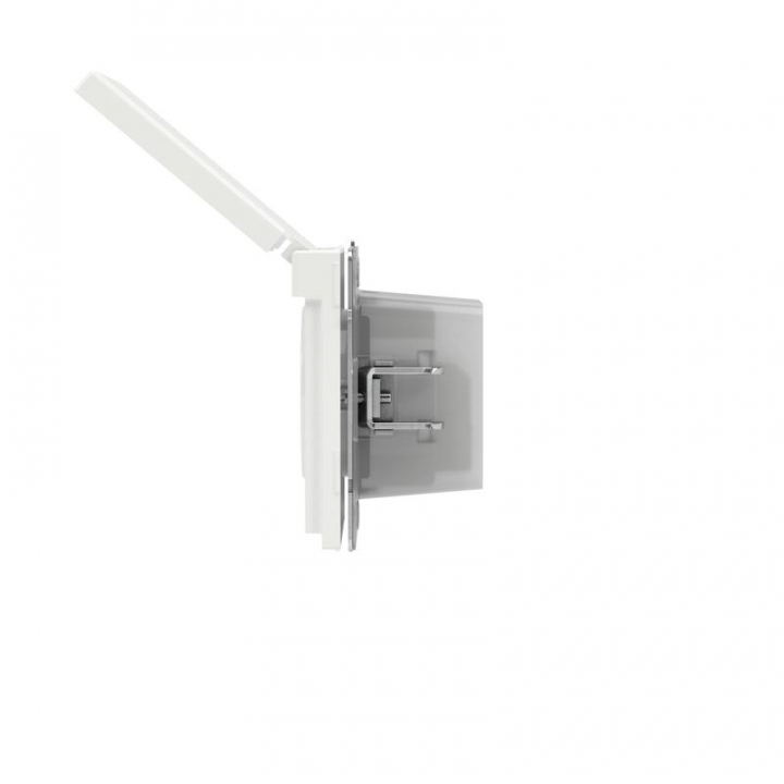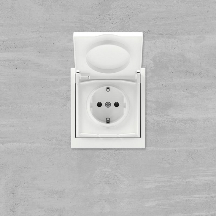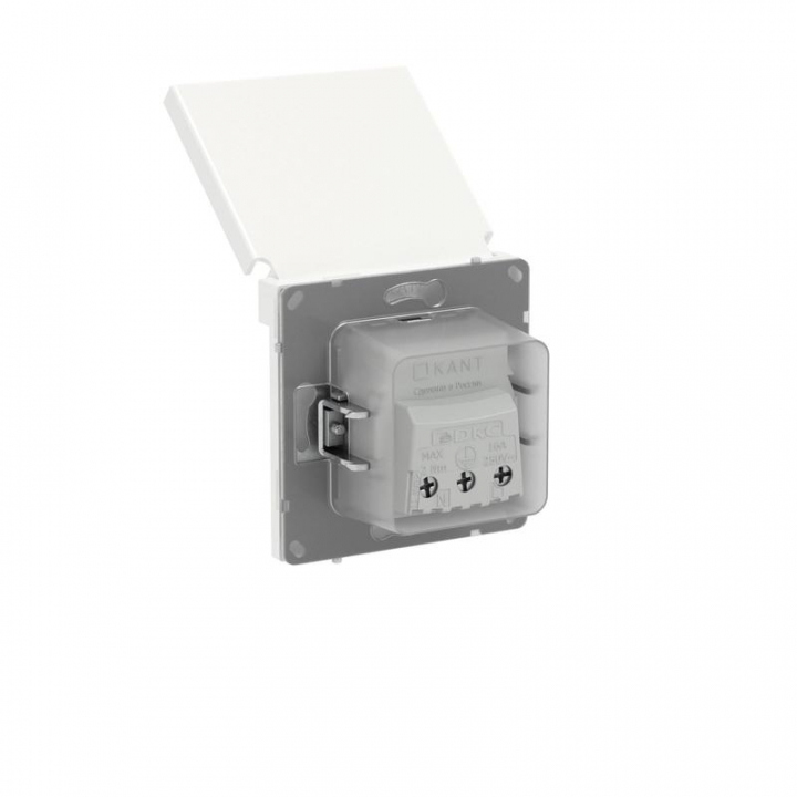 Розетка 2P+E (однофазная розетка с заземлением) с защитными шторками и крышкой применяется для подключения бытовых электроприборов во влажных помещениях. Предназначена для скрытого монтажа в стену. Характеристики устройства: номинальное напряжение 250 В, номинальный ток 16 А, степень защиты IP44. Материал: металл, поликарбонат. Пластиковые элементы устройства имеют цвет "Белая магнолия". Для декоративного оформления электроустановочных изделий используются рамки серии "KANT".