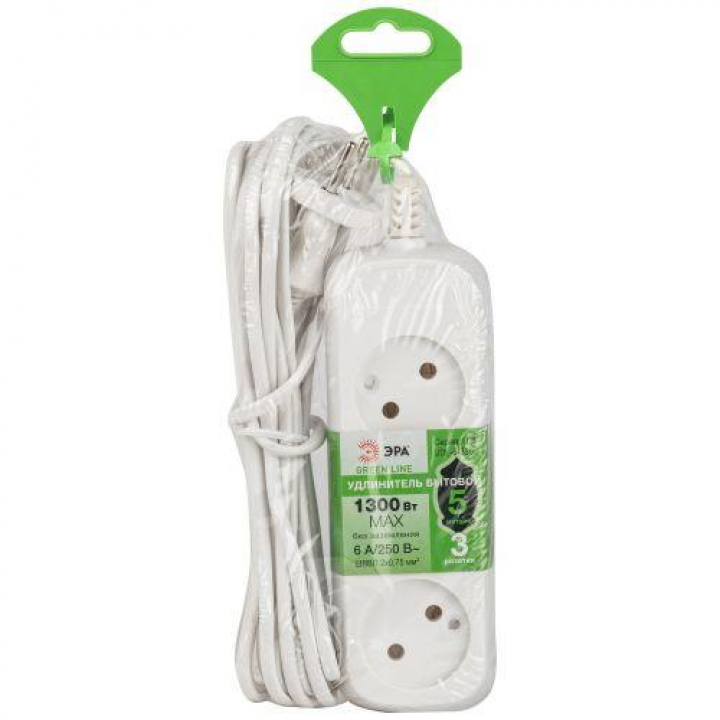 Удобный бытовой удлинитель ЭРА GREENLINE UDL-6-350 на 3 розетки, без заземления. Провод 5м ШВВП 2х0,75мм2. Рассчитан на одновременное подключение к розетке до трёх маломощных электроприборов. Максимальная нагрузка - 6 A/ 1300 Вт. Корпус изготовлен из прочного негорючего полипропилена, в составе - защищающие от возгорания антипирены.