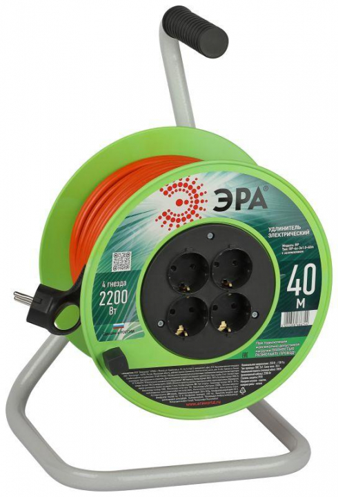 Удлинитель силовой на пластиковой катушке ЭРА RP-4e-3х1.0-40m с заземлением, 4 розетки, провод ПВС 3х1кв.м, 40 м. Мощность 10А/2200Вт. Используется для работы на строительных площадках или дачных участках. Удобен при работе с приборами, находящимися удаленно от стационарной розетки. Например, газонокосилки, электрические, пилы, триммеры или электродрели. Провод в удлинителях Эра сделан из 100% меди, что делает его абсолютно пожаробезопасным. Рама удлинителя сделана из высокопрочной стали, а пластиковой корпус выполнен с применением негорючих добавок.