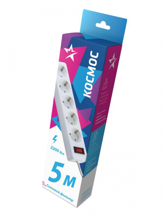 Удлинитель с сетевым фильтром 5х5м с заземл. 10А IP20 2.2кВт ПВС 3х0.75 с выкл. с индикатором сети бел. КОСМОС FKsm5m-5g(W)