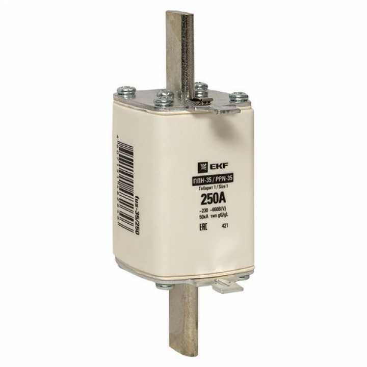 Плавкая вставка ППН-35 250/250А габарит 1 EKF. Предохранители плавкие ППН EKF, укомплектованные плавкими вставками типа gG/gL, предназначаются для защиты кабельных линий и промышленных электроустановок от токов перегрузки и короткого замыкания. Предохранители применяются в электрических сетях переменного тока частотой 50 Гц с напряжением до 660В. Применяются для крепления в распределительных и вводно-распределительных устройствах. Предохранители плавкие ППН могут устанавливаться в основание с держателем, а также в специально предназначенные рубильники. В комплект поставки предохранителей плавких ППН основание с держателем не входит и приобретается отдельно.