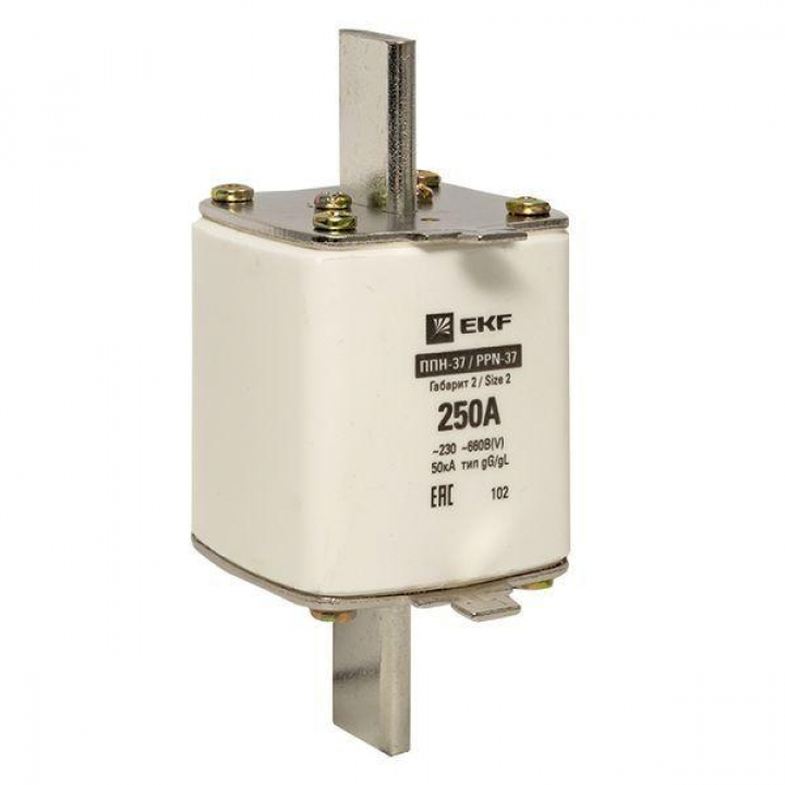 Плавкая вставка ППН-37 400/250А габарит 2 EKF. Предохранители плавкие ППН EKF, укомплектованные плавкими вставками типа gG/gL, предназначаются для защиты кабельных линий и промышленных электроустановок от токов перегрузки и короткого замыкания. Предохранители применяются в электрических сетях переменного тока частотой 50 Гц с напряжением до 660В. Применяются для крепления в распределительных и вводно-распределительных устройствах. Предохранители плавкие ППН могут устанавливаться в основание с держателем, а также в специально предназначенные рубильники. В комплект поставки предохранителей плавких ППН основание с держателем не входит и приобретается отдельно.