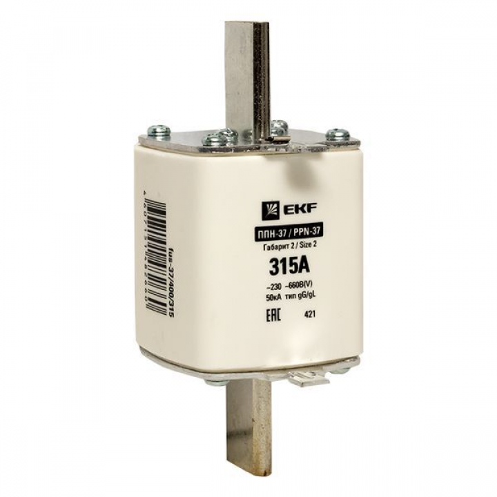 Плавкая вставка ППН-37 400/315А габарит 2 EKF. Предохранители плавкие ППН EKF, укомплектованные плавкими вставками типа gG/gL, предназначаются для защиты кабельных линий и промышленных электроустановок от токов перегрузки и короткого замыкания. Предохранители применяются в электрических сетях переменного тока частотой 50 Гц с напряжением до 660В. Применяются для крепления в распределительных и вводно-распределительных устройствах. Предохранители плавкие ППН могут устанавливаться в основание с держателем, а также в специально предназначенные рубильники. В комплект поставки предохранителей плавких ППН основание с держателем не входит и приобретается отдельно.