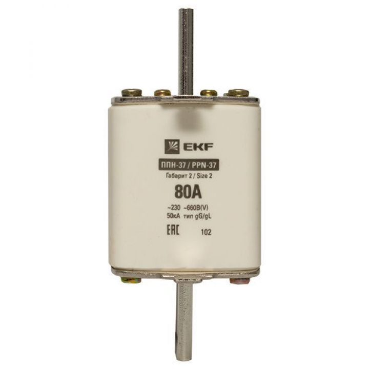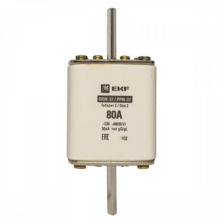 Плавкая вставка ППН-37 400/80А габарит 2 EKF. Предохранители плавкие ППН EKF, укомплектованные плавкими вставками типа gG/gL, предназначаются для защиты кабельных линий и промышленных электроустановок от токов перегрузки и короткого замыкания. Предохранители применяются в электрических сетях переменного тока частотой 50 Гц с напряжением до 660В. Применяются для крепления в распределительных и вводно-распределительных устройствах. Предохранители плавкие ППН могут устанавливаться в основание с держателем, а также в специально предназначенные рубильники. В комплект поставки предохранителей плавких ППН основание с держателем не входит и приобретается отдельно.