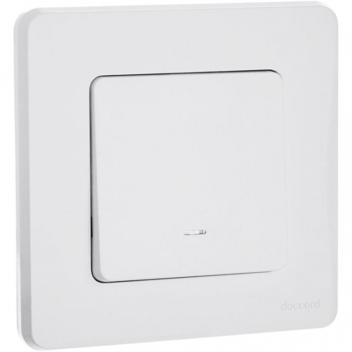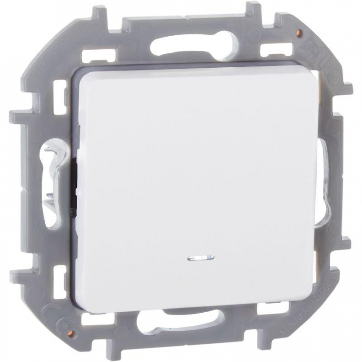 Выключатель одноклавишный с подсветкой/индикацией скрытого монтажа Inspiria, цвет "Белый", номинальный ток 10АХ, напряжение ~250В, безвинтовые зажимы. Устанавливается в жилых и общественных помещениях для управления приборами освещения, вентиляции и т.д.