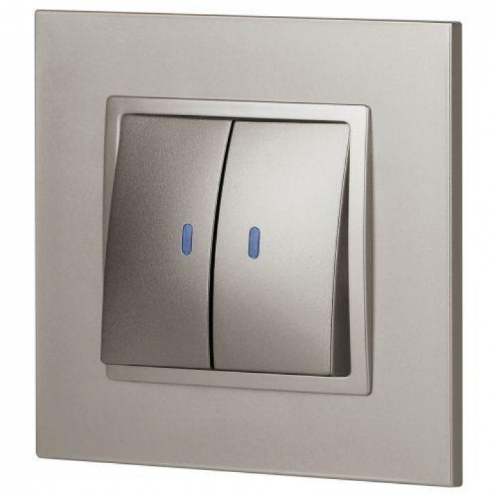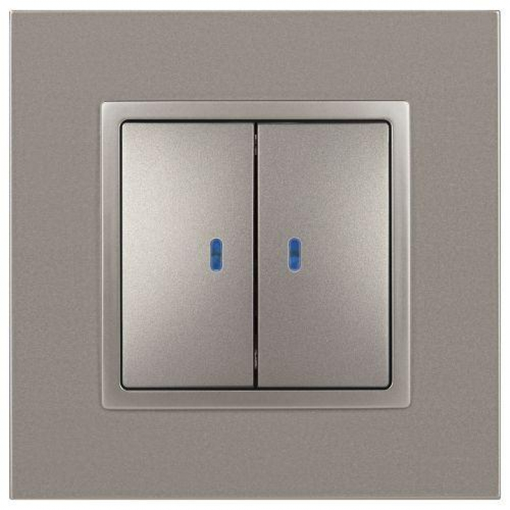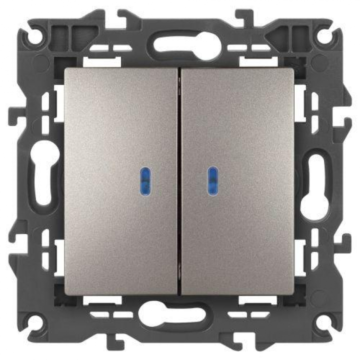 Выключатель 2-клавишный с подсветкой серии Эра Elegance цвет титан 14-1105-16. Характеристики 10А 250В. Оснащён автоматическими клеммами для надёжной фиксации жил кабеля в механизме. Рамки приобретаются отдельно.