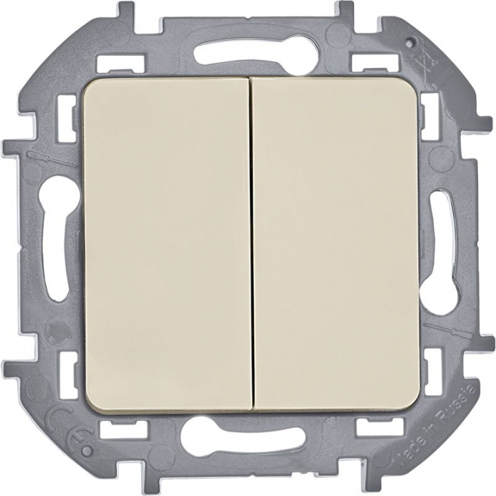 Выключатель двухклавишный скрытого монтажа Inspiria, цвет "Слоновая кость", номинальный ток 10АХ, напряжение ~250В, безвинтовые зажимы. Устанавливается в жилых и общественных помещениях для управления приборами освещения, вентиляции и т.д. Предназначен для управления двумя электрическими цепями.