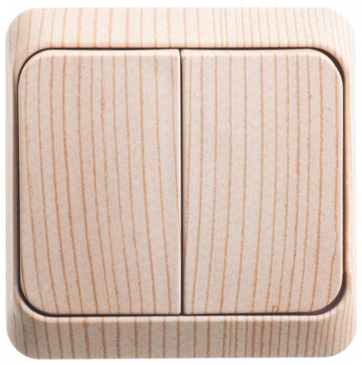 Выключатель Systeme Electric (ранее Schneider Electric) ЭТЮД (сосна, открытой установки) двухклавишный предназначен для применения в сетях до 250В, на ток до 10А. Две клавиши позволяют управлять двумя источниками света с одной точки. Изделия цвета Сосна обладают уникальным рисунком, напоминающим древесный сруб. Он прост в установке и удобен применении. Сделано в России.