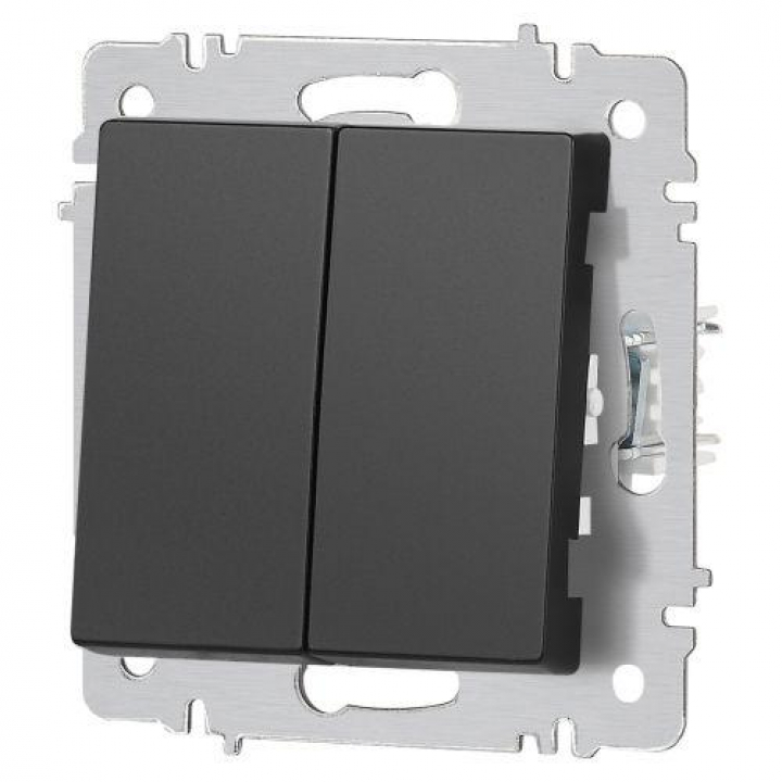 Выключатель 2-клавишный серии Intro Accent скрытой установки механизм цвет антрацит 6-104-05. Номинальные характеристики 10А 250В. Выполнен из негорючего термопласта, оснащён винтовыми клеммами. Парные клеммы обеспечивают соединение шлейфом. Монтаж в подрозетник производится и на лапки, и на винты. Рамка приобретается отдельно. В серии представлены рамки до 5 постов: на 1 пост - 6-501-хх, на 2 поста - 6-502-хх, на 3 поста - 6-503-хх, на 6 поста - 4-504-хх, на 5 постов - 6-505-хх (где хх - цветовой код: 01 - белый, 01М - матовый белый, 02 - слоновая кость, 03 - алюминий, 04 - шампань, 05 - антрацит, 06 - перламутр, 07 - графит, 08 - бронза, 09 - титан, 10 - венге, 11 - сосна).