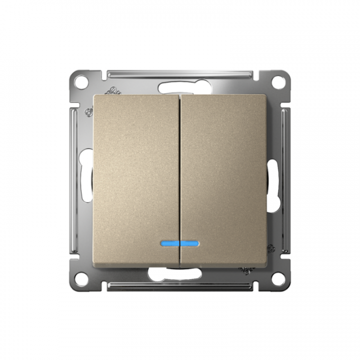 Механизм Systeme Electric (ранее Schneider Electric) серии AtlasDesign в цвете шампань выключателя 2-клавишного c подсветкой подходит для сетей 250 В, на ток 10 А. Благодаря светодиодной подсветке синего цвета изделие легко найти в темноте. Двухклавишный выключатель позволяет управлять двумя источниками света с одной точки. Лицевые детали из качественного ABS-пластика, устойчивого к царапинам и УФ-излучению.