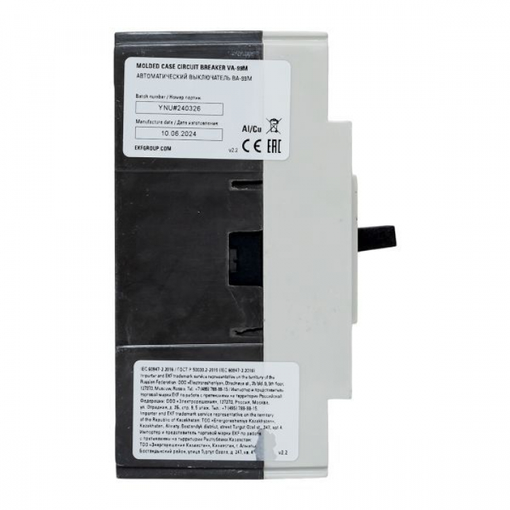 Выключатель ВА-99М выполнен в виде моноблока и состоит из основания и крышки с фальшпанелью, в которой имеется окно для рукоятки управления и толкатель кнопки «Тест» - проверки механизма отключения выключателя. Основание выполнено из термостойкой пластмассы, не поддерживающей горение и являющейся несущей конструкцией для присоединительных зажимов, неподвижных и подвижных контактов с системой дугогашения, механизма управления, блока защиты от сверхтоков. Крышка закрывает все подвижные элементы механизма управления и внутренние токоведущие части.