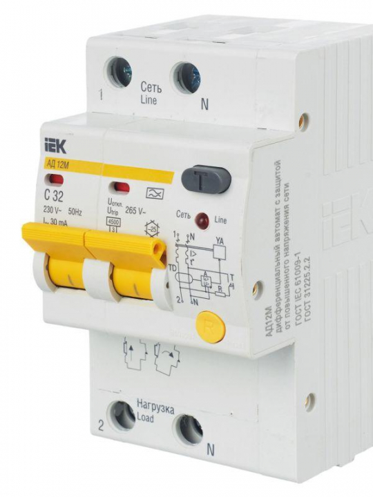 Быстродействующие защитные выключатели обеспечивают: в исполнении с уставками срабатывания 10 и 30 мА: - защиту людей от поражения электрическим током при прямом непреднамеренном прикосновении к токоведущим частям электрооборудования; в исполнении с уставками срабатывания 100 и 300 мА: – защиту от пожара из-за возгорания изоляции токоведущих частей; – защиту от перегрузки и короткого замыкания; – защиту от недопустимого повышения напряжения сети (АД12М). В изделиях предусмотрена индикация срабатывания от дифференциального тока, а для АД12М также светодиодная индикация включенного состояния. АД12М сохраняет работоспособность при снижении напряжения электрической сети до 110 В. В качестве коммутационных аппаратов в изделиях использованы выключатели автоматические ВА47-29 новой серии.