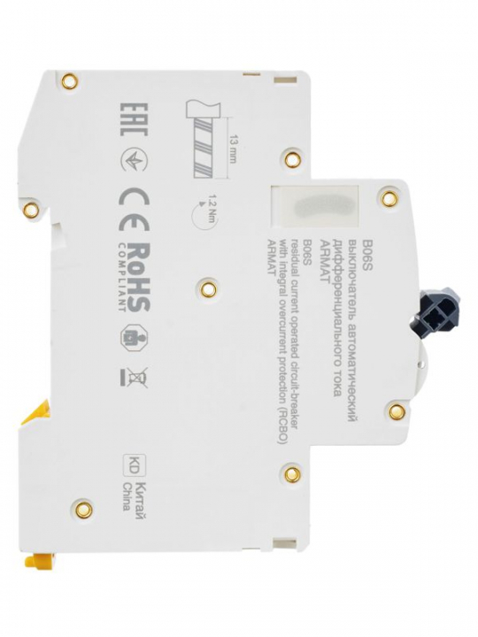 Автоматические выключатели дифференциального тока (АВДТ) ARMAT серии B06S могут осуществляют функции защиты от токов перегрузки и короткого замыкания и защиты человека от токов замыкания на землю. Модельный ряд включает в себя устройства с номинальными токами от 6 до 32 А, характеристиками срабатывания по сверхтоку B и C, типами защит AC и A с номинальным дифференциальным током отключения 30 мА. Номинальная отключающая способность АВДТ ARMAT серии B06S составляет 6 кА.
